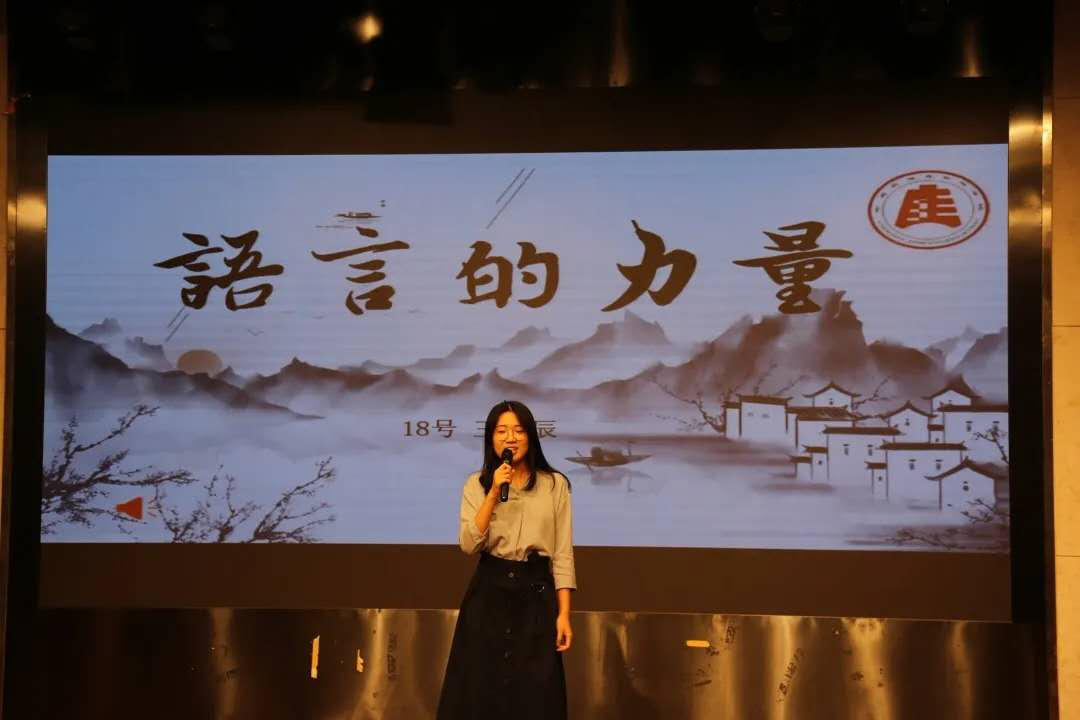 决赛中,公司王雨辰同学以语言的力量为题,以身边事例出发,抒发个人感悟,将国家通用语言与家国情怀联系在一起,展现出了w88win体育官网入口学子的对于民族团结的深刻思考和真挚火热的爱国之心,其温情脉脉的叙述以及娓娓道来的风格给人留下了深刻印象,并赢得了评委和在场观众的一致好评。