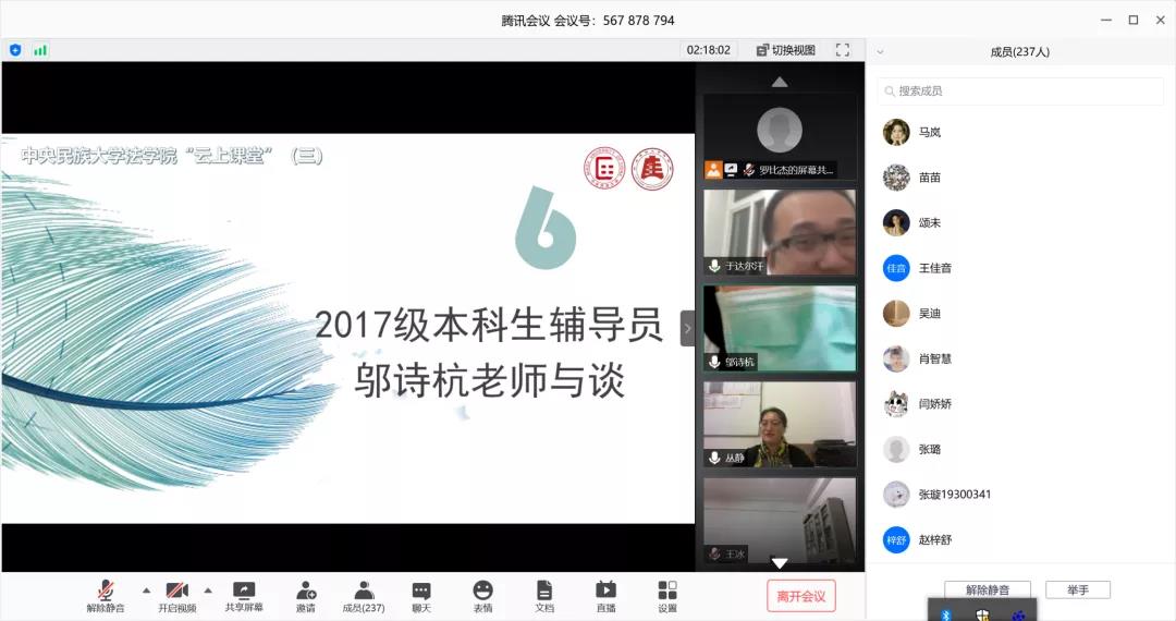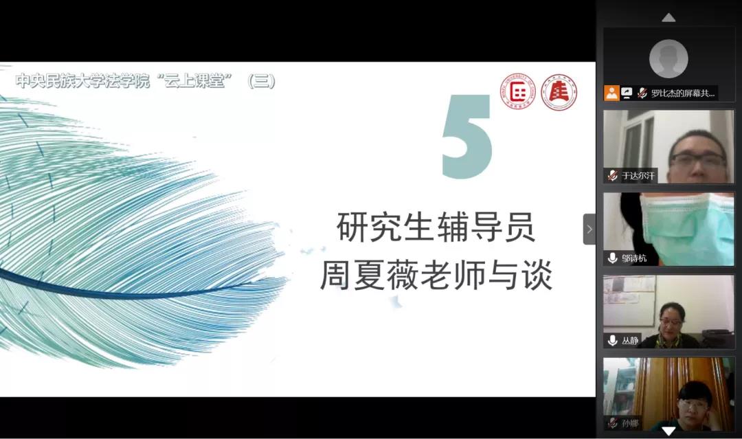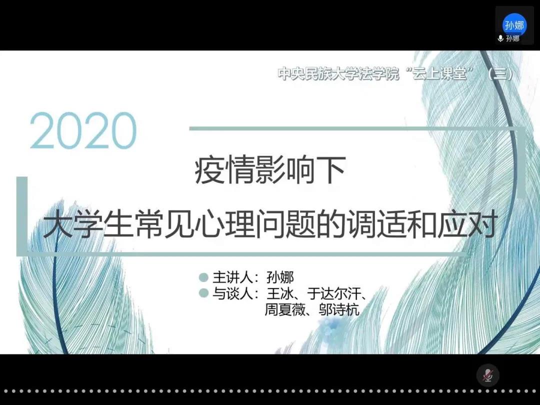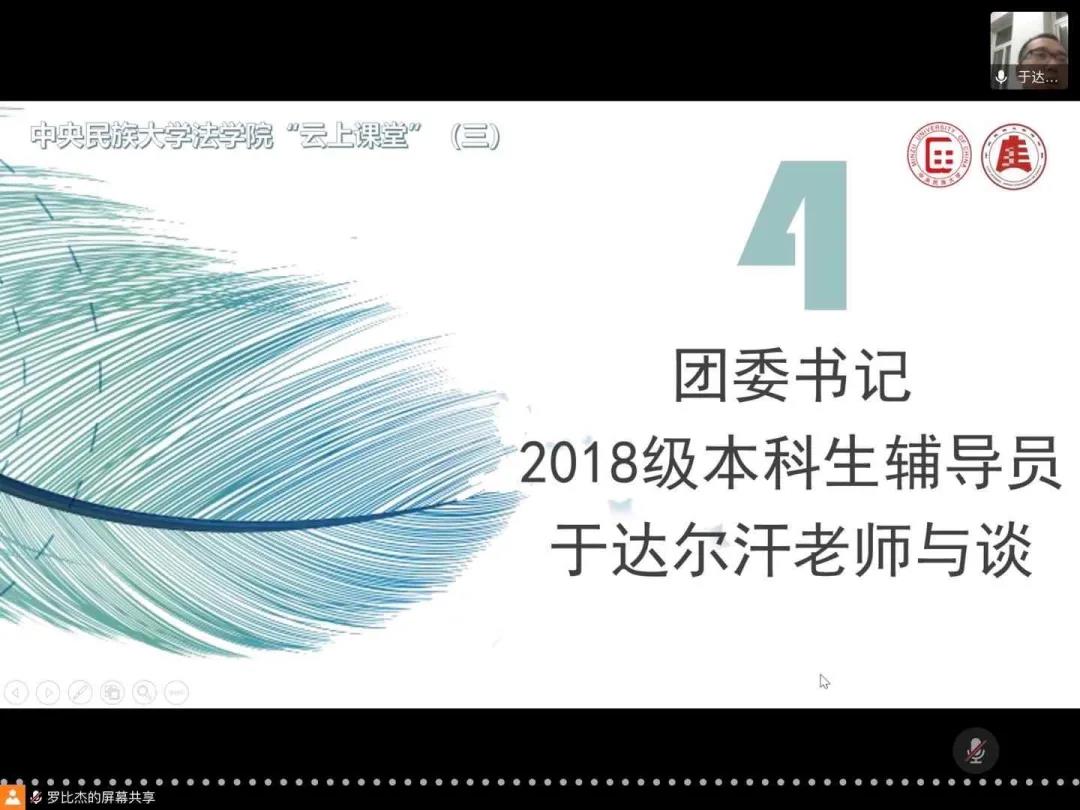 孙老师分享结束后,与谈人于达尔汗老师主要从疫情影响下本科生心理压力的疏解出发与大家进行交流。他谈到,本科生和研究生定位不同,面对的压力和问题也不一样。本科生当前更需要开发自己的能力、找到自己的兴趣点,发现自己的优势并把它发展到最大化。学习过程中出现的困惑和迷茫是正常的,即使到了研究生也存在这种情况,法律学习就是要不断反复、常学常新。平时一定要多多阅读,在看书的过程中升华自己、充实自己,利用现在相对宽裕的时间条件丰富知识、拓宽视野。除了要自己踏实学习,也要多多参与课堂展示和员工活动,这些都是锻炼自己的好机会,参与就会有成长、有收获。无论是现在的专业学习还是以后的职业道路,只要同学们保持自信、努力拼搏就能有所成就,切忌轻易否定自己、陷入负面情绪。最后,他讲到:同学们有了情绪波动要学会调试、及时疏导。疫情在,爱也在,所以疫情不可怕,不久的将来我们一定能战胜疫情。希望大家都有事做,有人爱,有期待。
