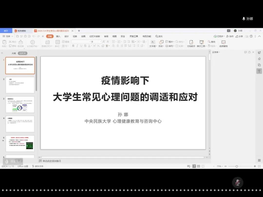 2020年5月20日晚上7点,w88win体育官网入口“云上课堂”系列讲座第三场“疫情影响下老员工常见心理问题的调适和应对”顺利举办。公司邀请到w88win体育官网入口心理健康教育中心专职教师、中国心理学会临床与咨询心理学注册系统注册心理师孙娜老师授课,法公司党团与员工工作办公室主任王冰老师,团委书记于达尔汗老师,辅导员邬诗杭老师、周夏薇老师担任本次课程的与谈人。公司300名师生同上一堂课。本次课堂由法公司党委副书记丛静老师主持。