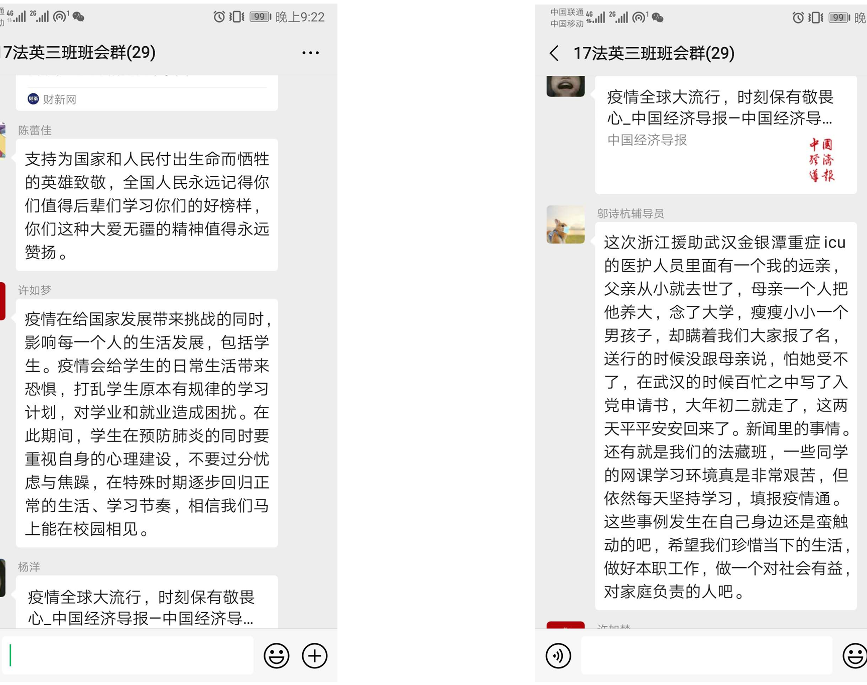 2017级法学1班的同学们在邬诗杭老师和班长的带领下,在微信群中各抒己见,交流了疫情爆发三个月以来的真切感触,分享了身边的抗疫事迹,同学们表达了对医护工作者的崇高敬意,并且表示要提高防控警惕,积极配合抗疫工作者。