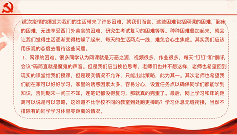 当前,国内疫情防控形势虽已拨云见日,然而形势依旧不容乐观。全院师生应时刻保持紧张,防止懈怠。此次“与爱同行,共克时艰”主题班会帮助同学们克服学习、生活方式变化产生的影响。学习上,各位同学应尽快调整学习计划,充分利用网络资源,努力适应网络教学环境,积极备战法考。生活中,同学们应保持文明健康的生活方式,正确处理亲情关系,建立和谐、有爱的家庭关系。思想上,同学们应坚定理想信念,涵养家国情怀,深刻认识中国特色社会主义的制度优势和大国担当,提高思想内涵,增强爱国心,实践报国行。祈愿山河无恙、国泰民安,期待战胜疫情、春暖花开。