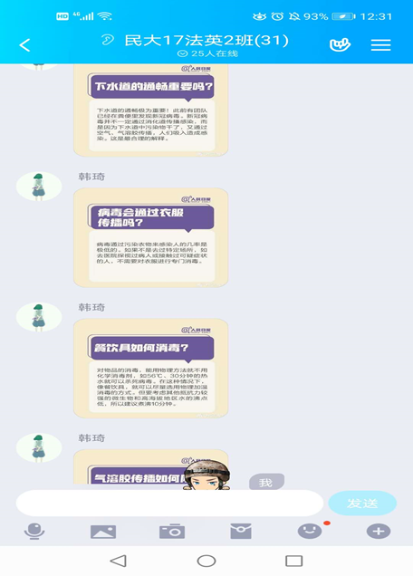 2017级法英3班的同学们在微信班群中展开讨论,同学们纷纷表示疫情期间切勿懈怠,及时调整状态,回归正常的生活、学习节奏,认真上好每一节网课,并且期待疫情结束后,在w88win体育官网入口的校园重聚。