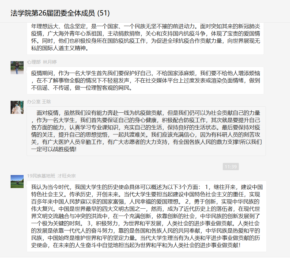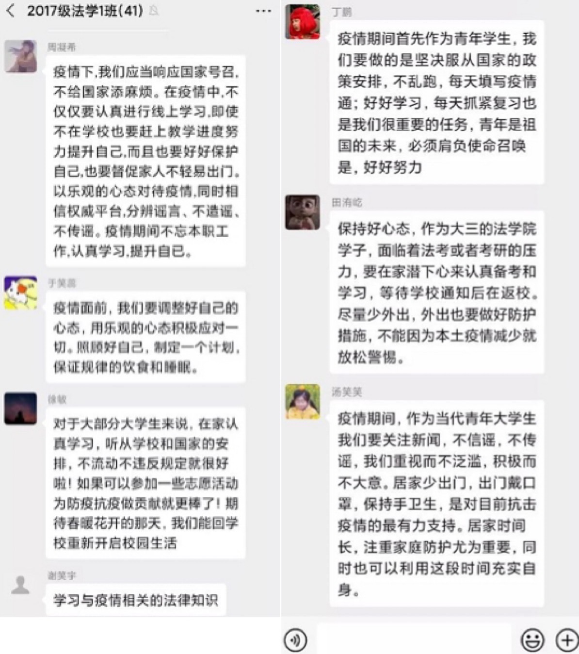 2019级本科生各支部团员展开讨论,在抗疫防疫的关键时期,做到停课不停学,练就过硬的法律专业技能,争取为国家的法治建设贡献自己的一份力量。作为青年团员,即使不能站在最危险的抗疫一线勇作斗争,也应该做到不添乱、不捣乱,积极配合疫情防控工作;不信谣、不传谣,稳定情绪,多多向身边的人传播正能量。