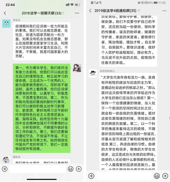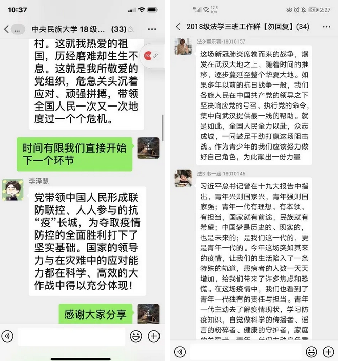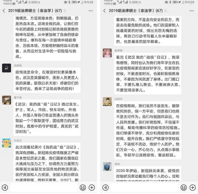 2017级本科生各支部团员在观看纪录片后分享了心得体会,表达了对医护人员在抗疫期间无私奉献的敬佩和动容。身为大三学子的他们,在面临着法考或考研的压力之时,更要保持好心态,在家潜心学习和备考。持续关注疫情情况,关注国内外的各种情况,接收官方渠道的消息,做到不传谣、不造谣,理性科学地看待国际上发生的一些事件。
