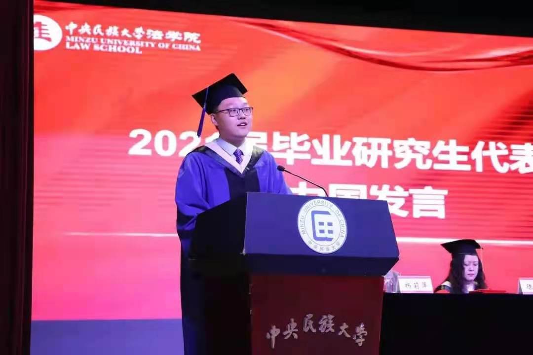 我是2019级法律法学硕士生张力国,非常荣幸能够作为2021届毕业研究生代表在此发言。今年的典礼不太一样,现场的毕业生不仅有我们2021届的同学,还看到赶回来的2020届的师兄师姐和同学们,十分亲切!今天,站在这里我有些忐忑,因为每位同学在民大都经历了不一样的故事,有不一样的精彩,每位同学都是那么的与众不同、不可替代,只希望我下面的心里话也是你们的心里话。