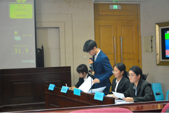 第二场,正方首先提出《商标法》第八条中的“等”应作“等内”解释的论点,发言过程体现了深厚扎实的法学知识功底,对于相关法条及其解释信手拈来、了如指掌。反方从气味、声音等新型商标发展的可行性、传统的以文字和图样为主体的商标设计不利于盲聋哑人群等方面进行反驳,举出生活中的例子,令人信服。正方紧随其后,列举诸多相关科学研究的结果及数据为自己的观点做支撑,增强了发言的专业性。