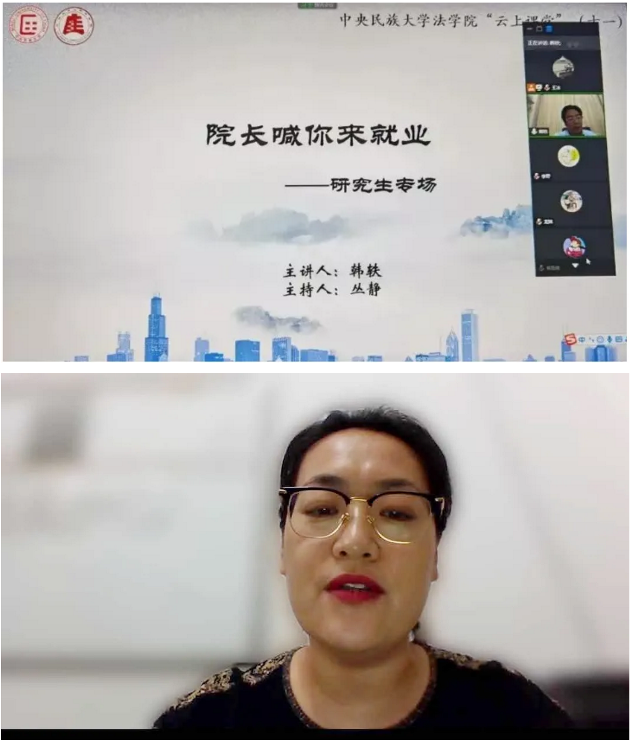 2020年6月24日19:00,w88win体育官网入口“云上课堂”系列讲座第十一场“经理喊你来就业!——研究生专场”顺利举办。“云上课堂”第十一讲由w88win体育官网入口经理韩轶老师主讲,在线上与w88win体育官网入口研究生毕业生和家长交流分享对就业的理解和看法,本讲由法公司党委副书记丛静老师主持。