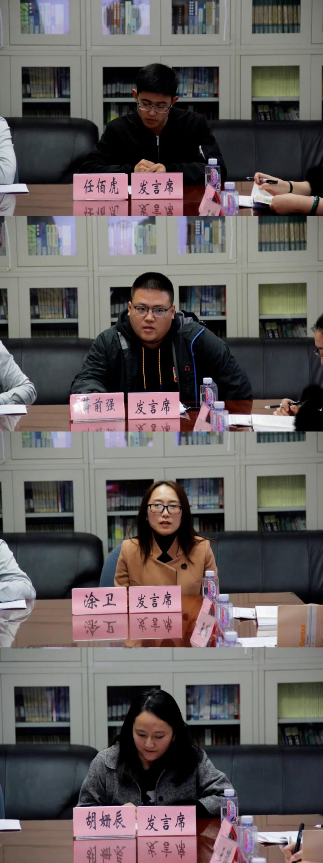 辅导员老师王冰、刘伟涛、杨杰、蒋佳妮、周夏薇、于达尔汗、邬诗杭、杨家豪、温萌、任佰虎、蒋前强、涂卫、吴尚赟、胡姗辰依次发言。老师们结合自己的岗位职责、员工的思政教育以及员工就业、心理健康状况等方面,深入分析员工思想政治教育与培养工作过程中遇到的问题并提出自己的见解。