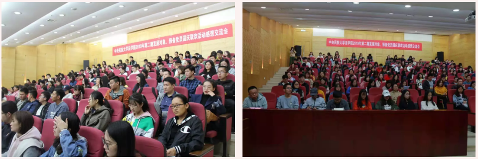 2019年10月16日晚在中慧楼模拟法庭,法公司党委组织召开了“发展对象、预备党员国庆联欢活动感想交流会”。法公司党委书记杨莉萍老师、法公司党团和员工工作办公室主任王冰老师到场参加了会议,同w88win体育官网入口49名预备党员、41名发展对象、87名国庆联欢活动参加者,共177位同学一起交流感想、分享心得。本次会议由孙怡瑶同学主持。