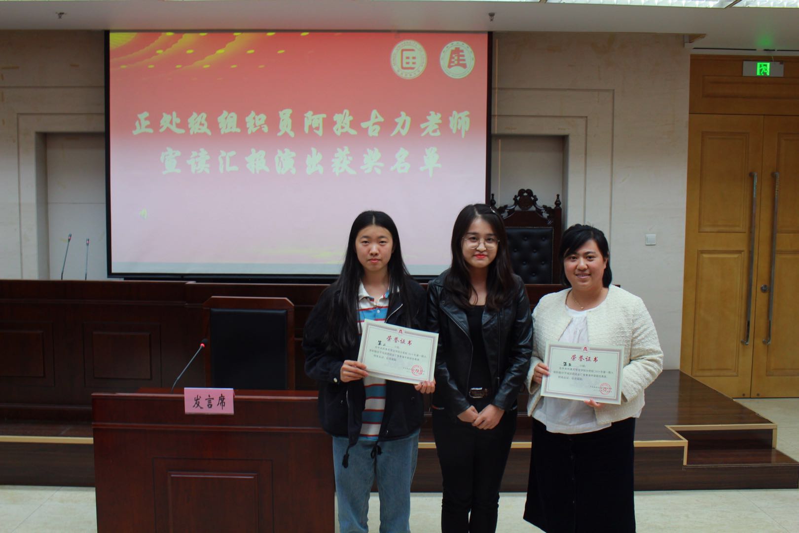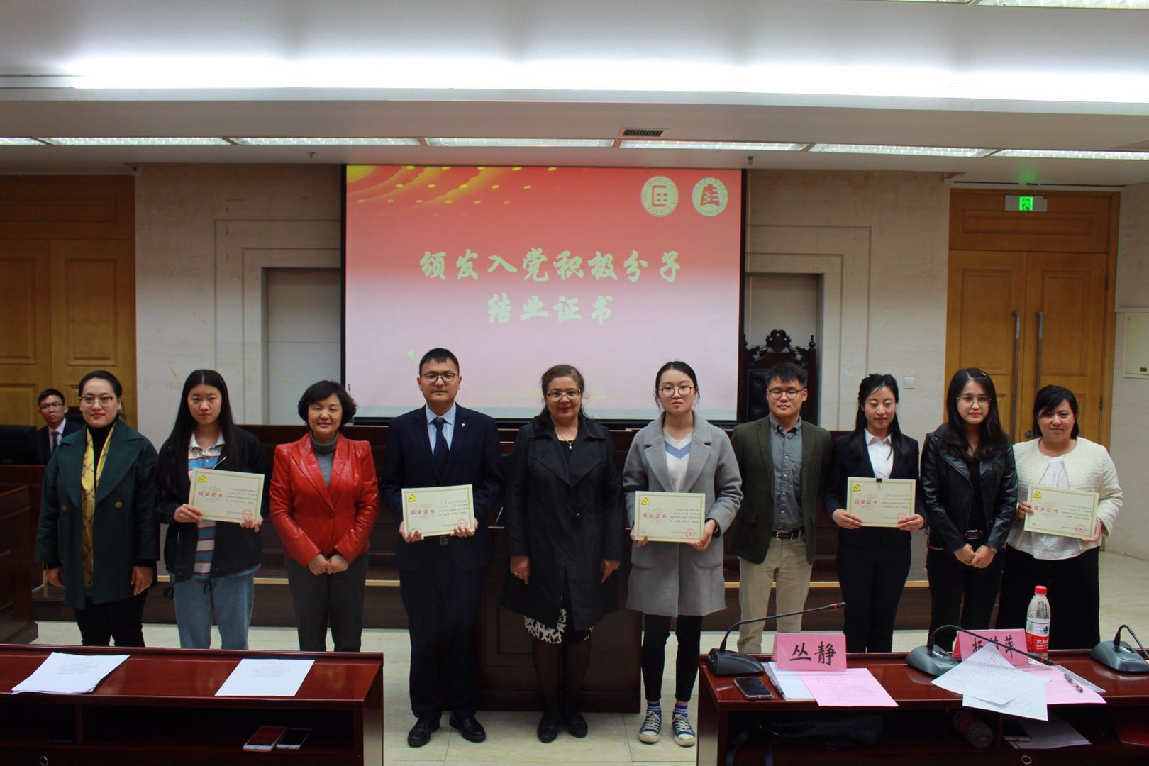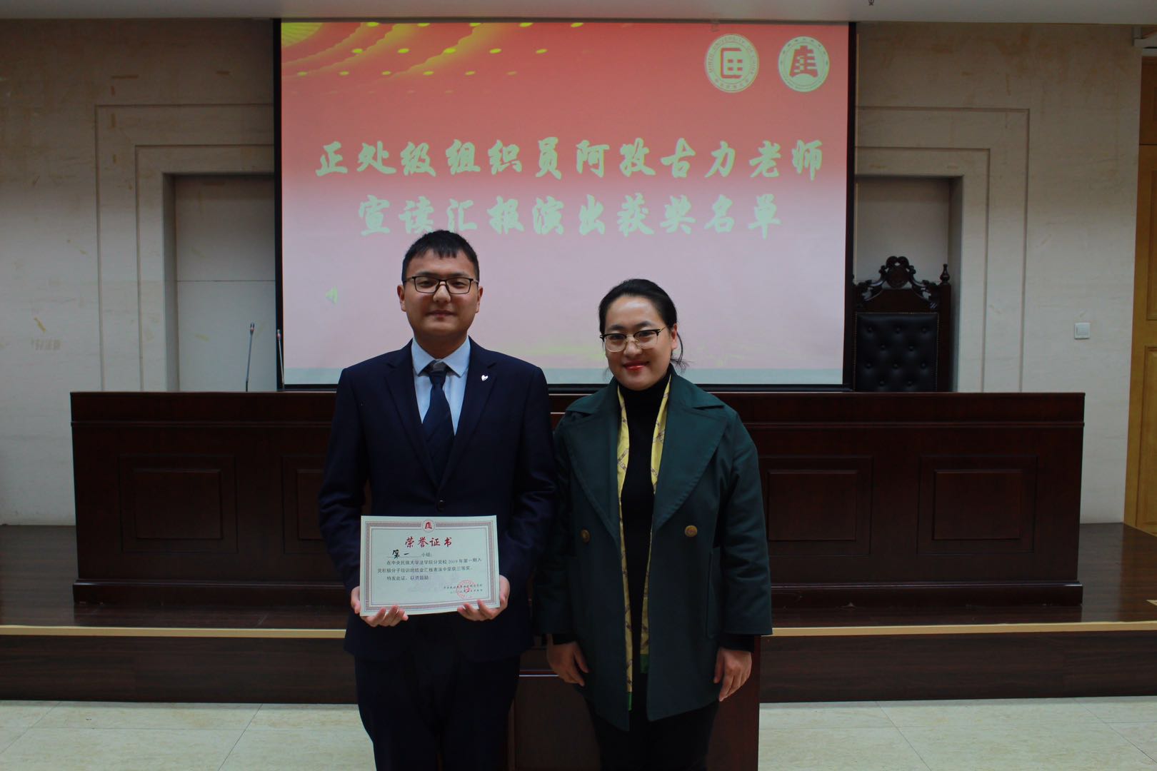 随后,阿孜古力老师宣布了汇报表演的获奖名单,杨莉萍老师、阿孜古力老师、丛静老师、王帅老师、刘梦溪同学为各组入党积极分子代表颁发结业证书并为各获奖小组颁奖。